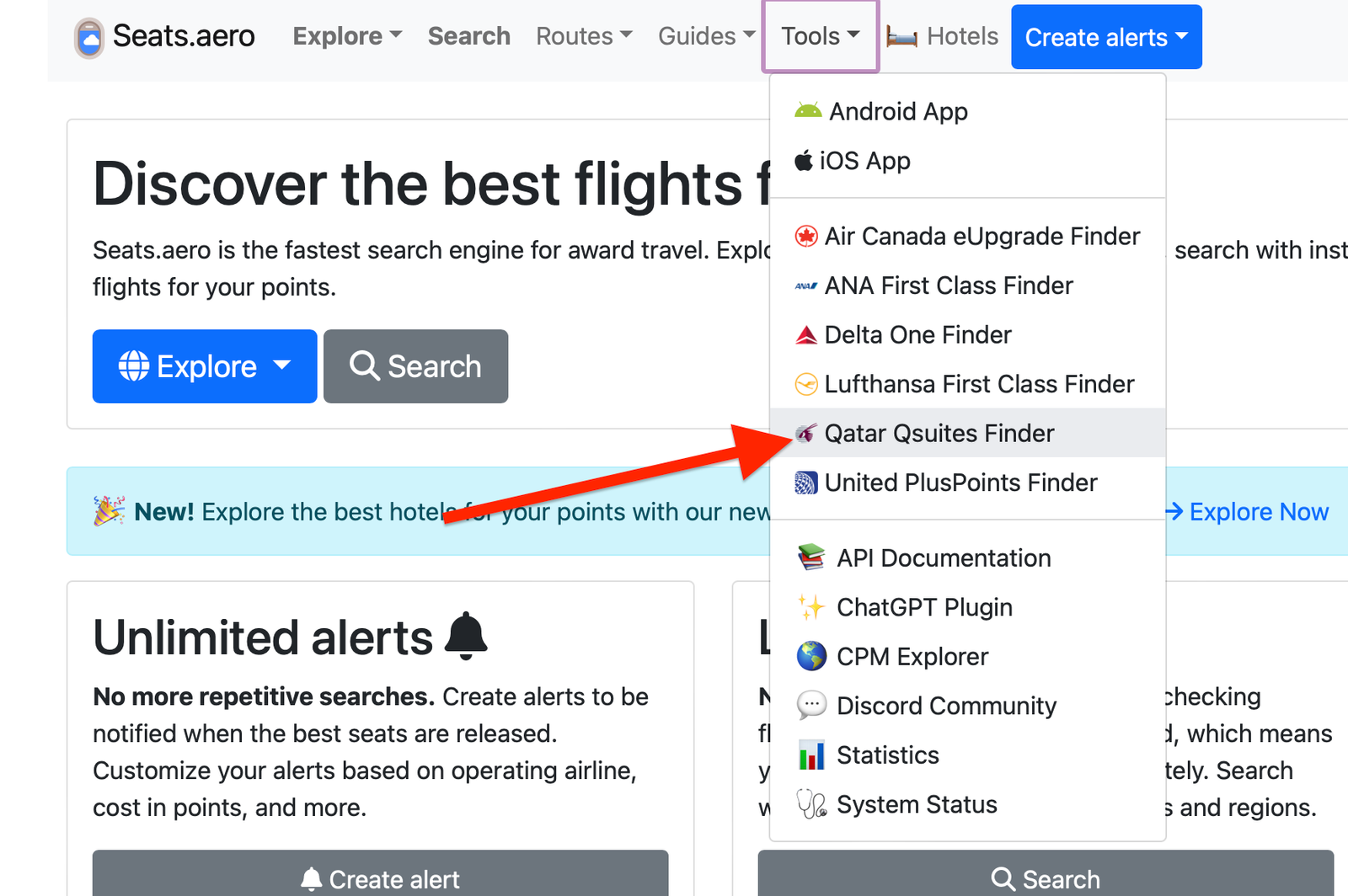 I did use the pro version for this search, but the same steps apply if you are using the free version and simply looking at the next 60 days. From the home page, you will see tools at the top. Click tools and then select Qatar Qsuites Finder.