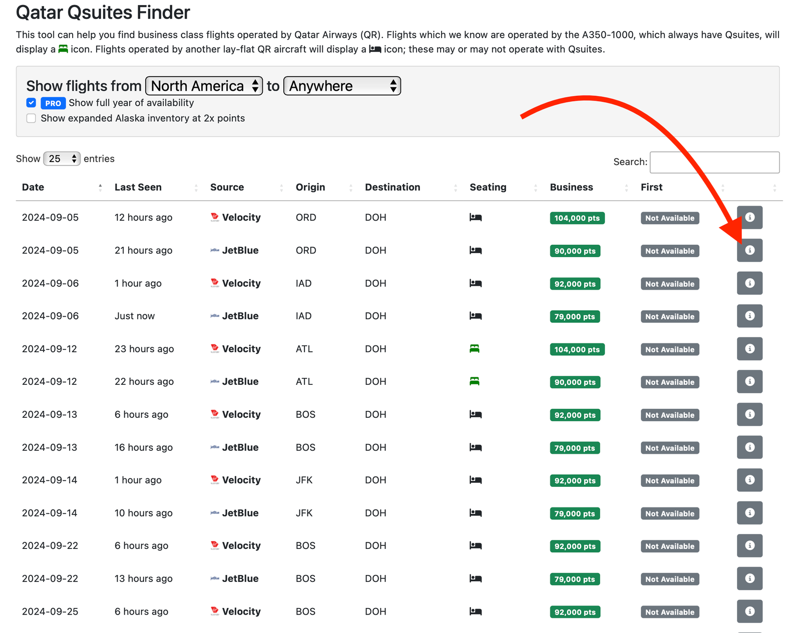 I like to start my search for any award flight on my favorite award search site. For Qsuites, that is seats.aero. (Other award flight search sites I use regularly include point.me, roame.travel, and pointsyeah.com).