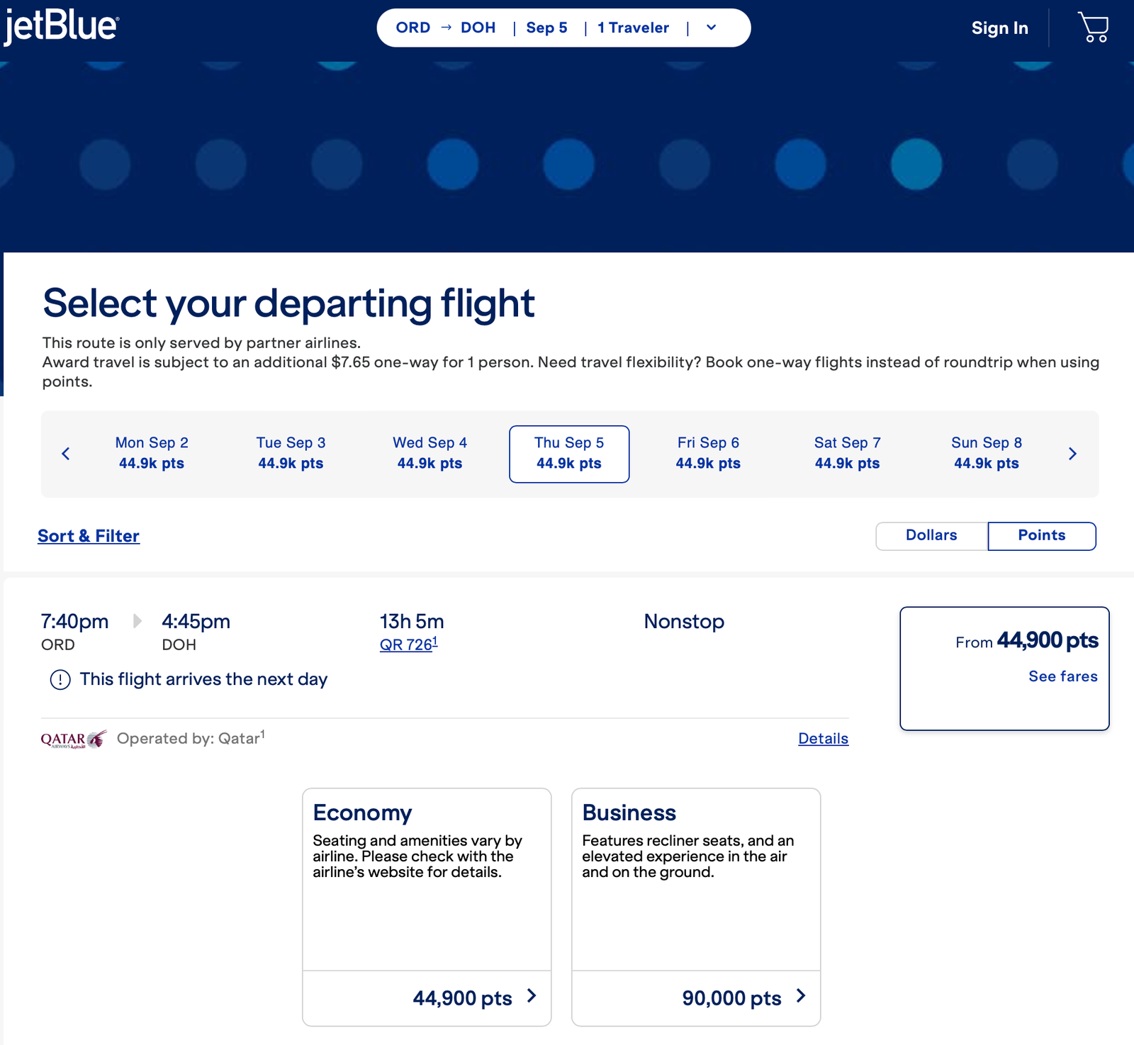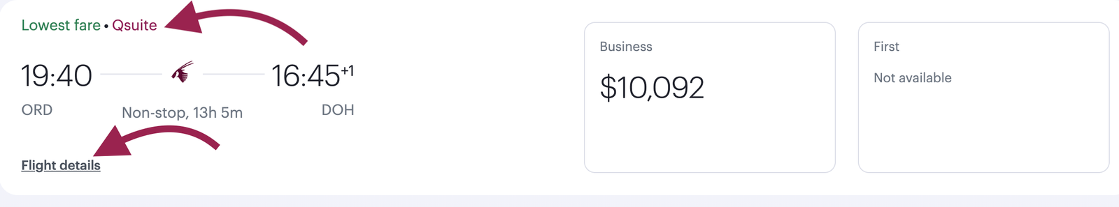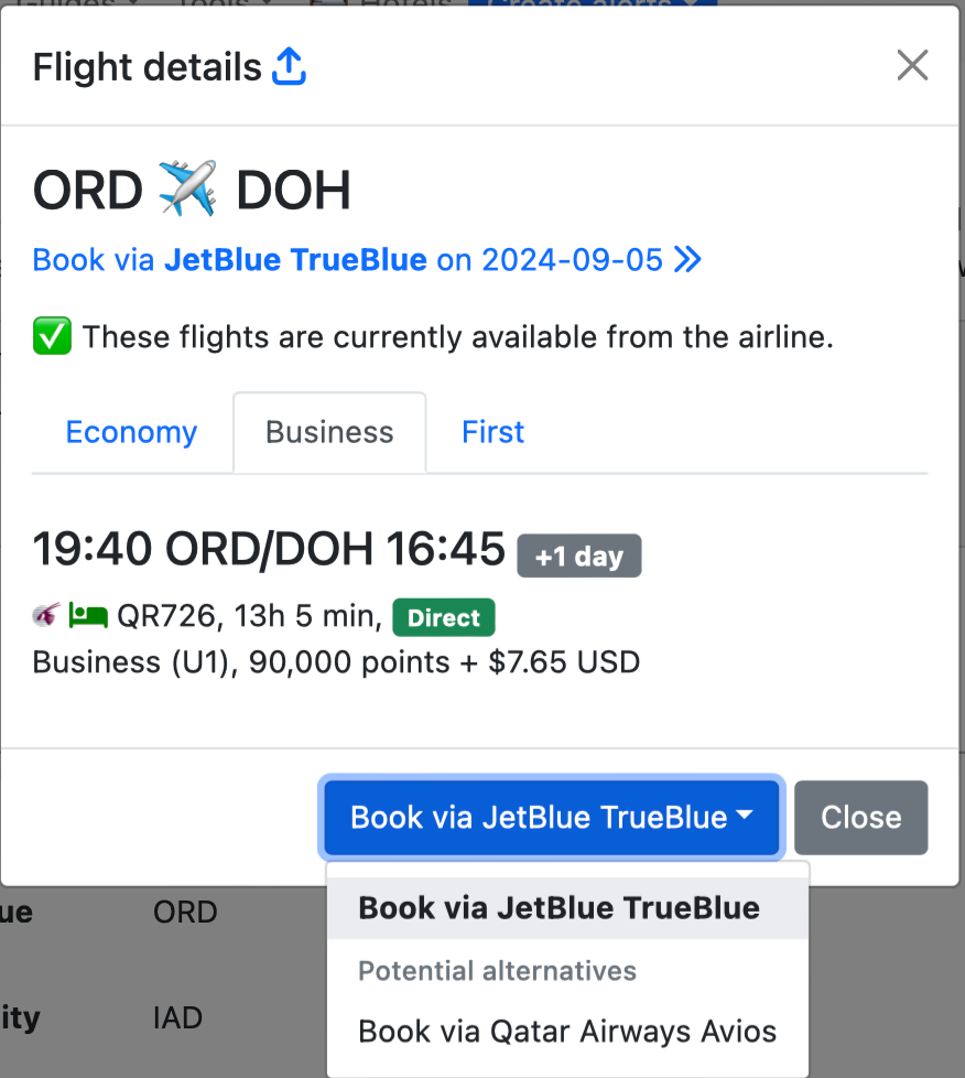 Click on Book via JetBlue TrueBlue and you will be sent straight to that specific flight on JetBlue’s site. From there, you would click on the from 44,900 pts in the example below and it will bring up the options to book. If business is available, that is the Q-suite. IMPORTANT! Always confirm availability directly on the airline website prior to transferring any points! Award availability may show up on one of the award flight sites, but then ultimately not be available any longer. For Qsuites, I also like to confirm that the flight has Qsuites. The most accurate way to do this in my opinion is to go directly to Qatar’s website, search the same route and date, find the flight number, and make sure it says Qsuites by the flight as pictured below and then confirm the flight number by clicking flight details and checking the flight number and details with the flight you are booking on JetBlue. Once confirmed, you are ready to book! Back on JetBlue’s site, click the Business class flight, log into your JetBlue TrueBlue account, and book.