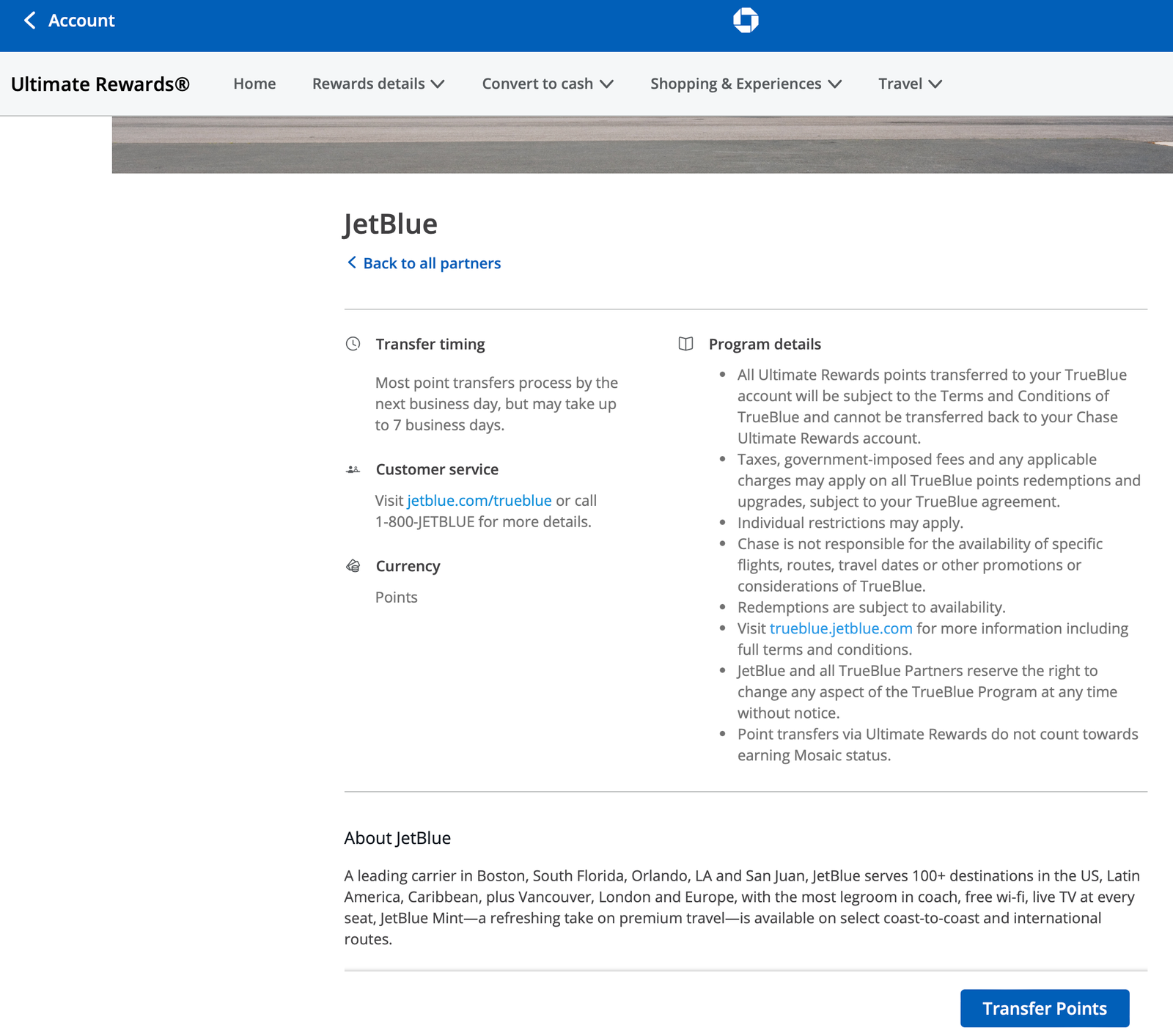 Next you’ll get the transfer points page and you’ll scroll down to find the partner you are transferring points to, in this case, JetBlue. One quick note is that you have to have at least 1000 points in order to be eligible to transfer points. Once you find the partner you want to transfer to, select the partner and it will bring you to their page where you will select Transfer Points