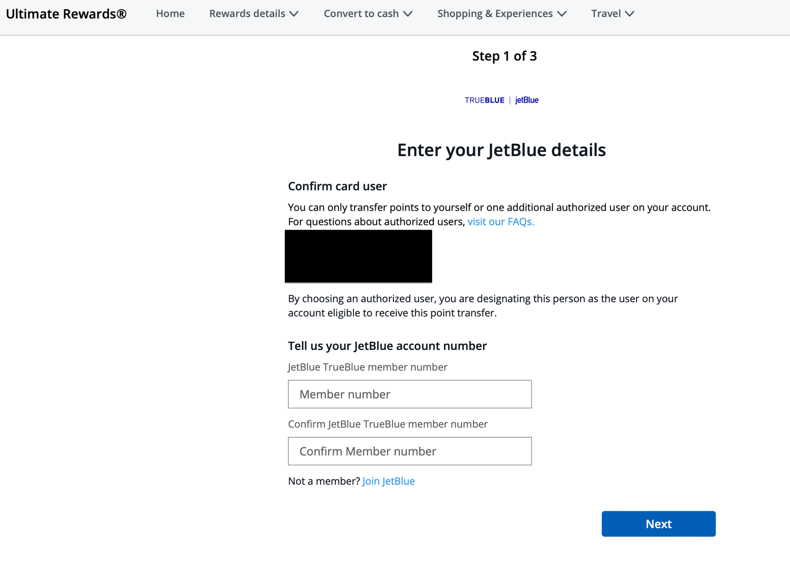 Next, enter your JetBlue (or other partner’s) member number and then hit next.