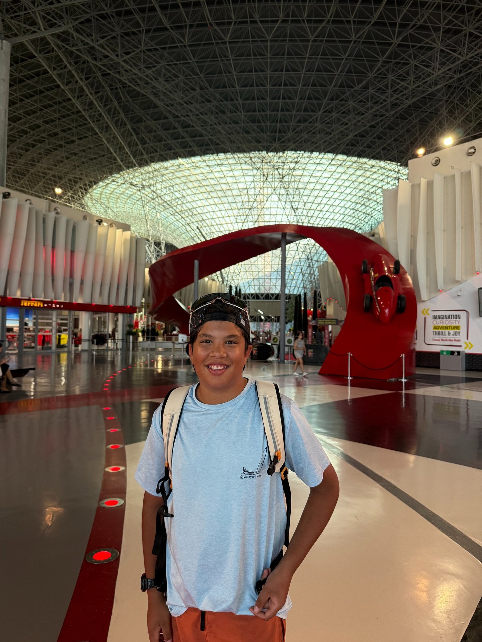 We made it to the mall and Ferrari World area. In October 2024, the world’s fastest coaster was currently closed, so we ruled out a visit to Ferrari World right away before Micah could even ask. It will likely be added to our future family trip to Abu Dhabi. We went inside the mall and took some photos around the entrance of Ferrari World (which is on the second floor of the mall).