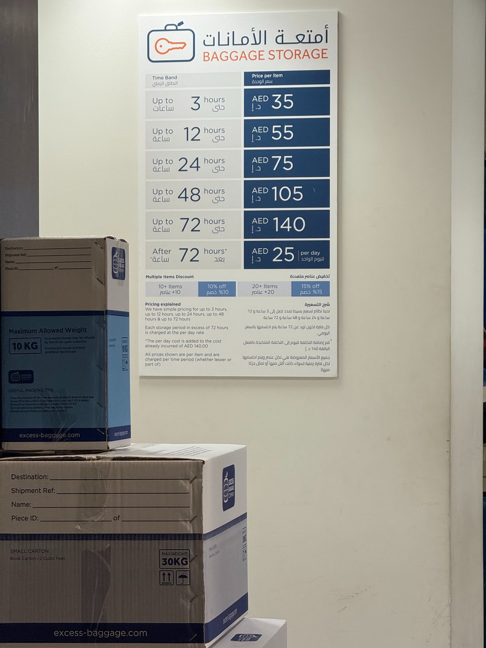 The Excess Baggage Company is located in Terminal A of Abu Dhabi International Airport, easily accessible for travelers. The cost for this service is pretty reasonable, and at the time of posting, it was 55 AED ($15 USD) for the first 12 hours, with incremental fees for additional hours (see photos below). This pricing structure makes it a viable option for those wishing to maximize their brief time in the city. They are also open 24 hours a day, making it a very convenient option to store your luggage. Of course, those hours and rates are subject to change, so please confirm when dropping off your luggage.