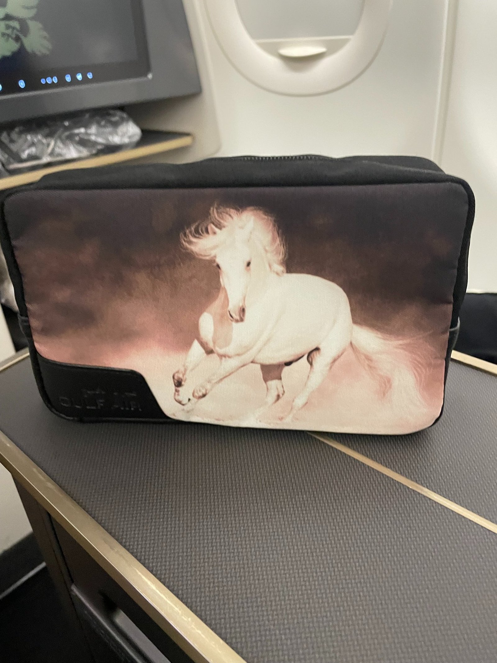 Gulf Air provides business class passengers with a nice amenity kit that contains skincare products from Aigner, as well as a dental kit, an eye mask, earplugs, socks, and a comb. The kit comes in a fun decorative pouch with a picture of a horse that can easily be repurposed after the trip.