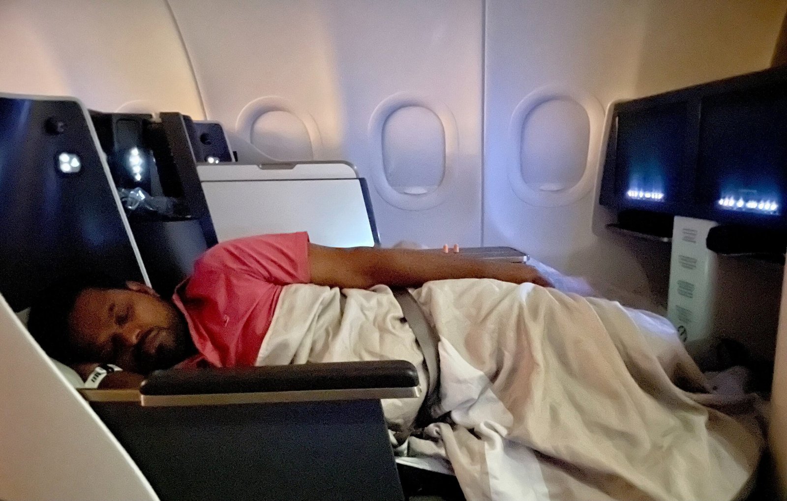 Gulf Air has installed the Collins Aerospace Diamond seat on its A321neos, which is a very comfortable and spacious seat for a single-aisle aircraft. The seat is 21 inches wide and has a pitch of 45 inches, which means plenty of legroom and recline. The seat also converts into a fully flat bed, which is a rare feature on narrow-body planes. The seat has a large touchscreen monitor, a personal reading light, a universal power outlet, a USB port, and ample storage space. We strategically planned this flight overnight so we could sleep and arrive in Paris rested to make the most of our 1-day stopover there! Shortly after takeoff from Bahrain, the crew offered to make our beds and we all eagerly accepted the offer. The lie flat seats were more than comfortable and all of us were able to get about 5 hours of sleep. Our only complaint was that the flight was too short and we would’ve loved a few extra hours of bliss in the comfort of Gulf Air’s business class!