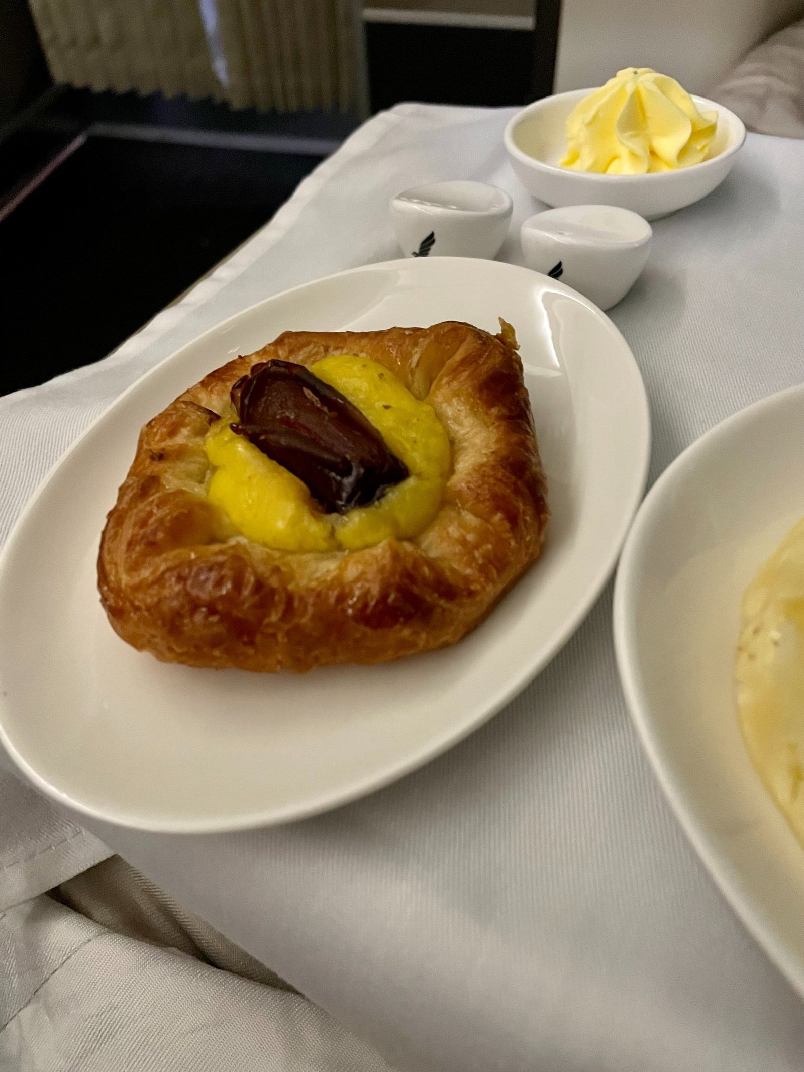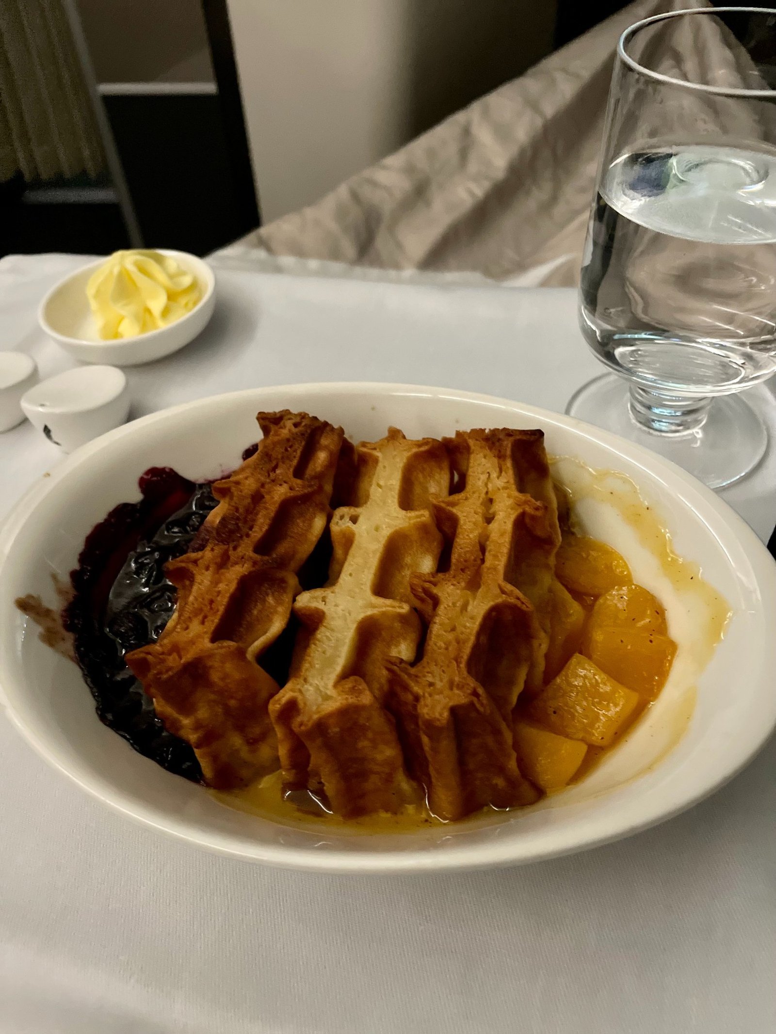 Because this was an overnight flight, we weren’t too interested in the food. We were really more focused on getting sleep that the meal offerings. After take-off they did offer a light snack (a sandwich of some sort I believe, but we all declined). They did serve breakfast before arrival in Paris and it was delicious. We had the waffles with fruit compote served with fresh fruit and a pastry. The portions were generous and the presentation was elegant. The food was served on china plates with metal cutlery and linen napkins. The drink selection was also impressive, with a variety of juices, soft drinks, wines, beers, and spirits.