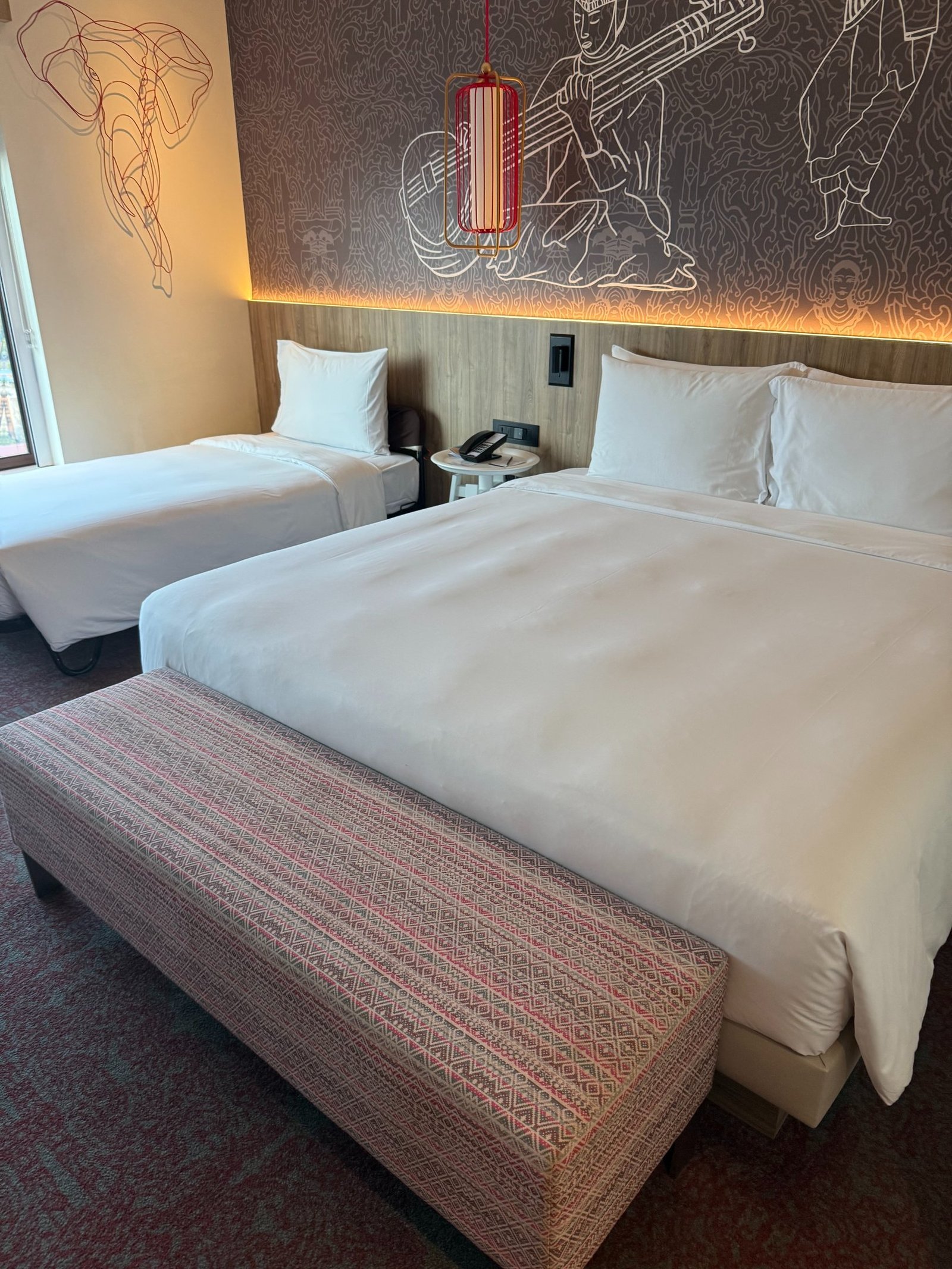 Upon arrival, we were greeted outside by staff waiting to help with our bags. Once inside, we were immediately welcomed by the front desk staff. My Hyatt Explorist status was acknowledged immediately, and we were offered a welcome drink. The check-in was quick and efficient and the staff were more than willing to accommodate our family of 4. I had booked a standard king room with a sofa bed and they quickly upgraded us to a higher floor and larger room in the corner. They gave us two options for our room and one of the front desk staff took us upstairs to see the room. Initially, we planned on having ND and one of the kids sleep at the IHG hotel as we were trying to book as many nights on points as possible during our 9 weeks abroad and ND has a nice stack of IHG points. We didn’t realize the staff at this hotel would be so accommodating and allow us to choose between 2 rooms and also place a rollaway bed at no extra charge. Additionally, the larger room that did not have a sofa bed, but just had a sofa ended up working perfectly for our family. Our youngest fit well on the sofa and the staff quickly brought a sheet, pillow, and duvet for him and made a bed for him there. Our oldest easily slept on the rollaway bed and my husband and I were left with the king. This allowed us to all stay in the same hotel (and save some IHG points for another stay!) It was a win-win and we really were so appreciative of the staff being so accommodating. The check in and welcoming process truly set the tone for our stay at the hotel!