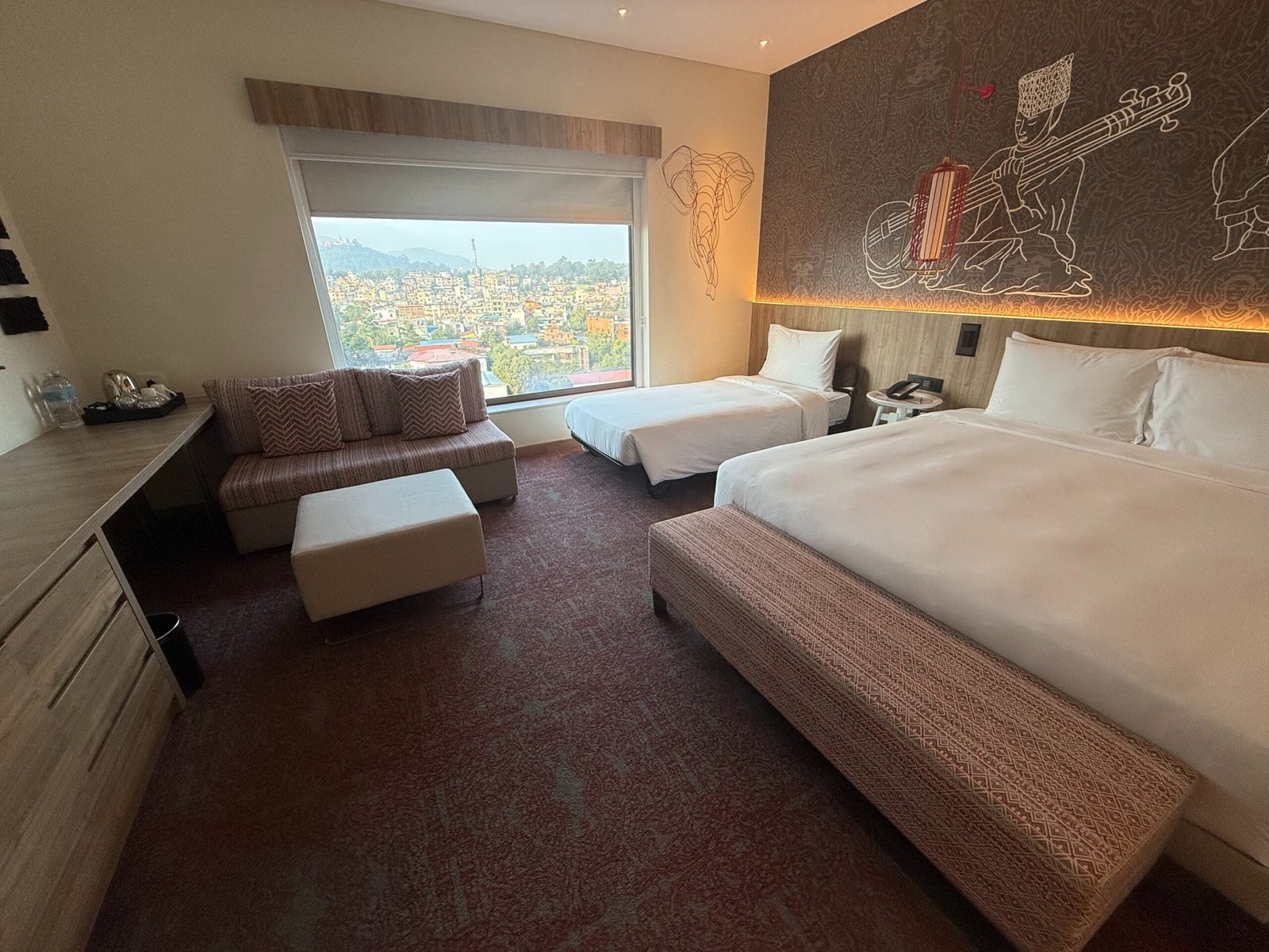 For our stay, I booked a standard King Room with Sofa Bed, but we ended up staying in a King room with a sofa seater. This was because the sofa seater was large enough for our 9-year to sleep on and the room was larger to give us more space with the rollaway bed. Having come from two hotels with smaller rooms, we really appreciated the size of the room, the closet space, and the desk area with drawers. Inside the room we had a very comfortable king-sized bed, a sofa seater, a desk, mini fridge, large closet, and spacious bathroom with a large walk-in shower. There were 3 drawers in the desk which were very useful to keep all the things a little more organized. With 4 of us in a hotel room, traveling for 9 weeks, organization is so helpful and a place to put “all the things!” is so appreciated! The closet also had a nice hang up area, adequate shelving, and a large drawer. The thoughtful storage really added to the value of this room. The bathroom was well stocked with soaps, shampoo and conditioner, toothbrushes and toothpaste, blowdryer, and face cloths/wash cloths (which aren’t always available in hotels in Nepal). There was an iron and ironing board, in-room safe, tea and coffee station, and a TV with Google Chromecast streaming abilities. All of these amenities and the overall space and design of the room really added to the value for us!